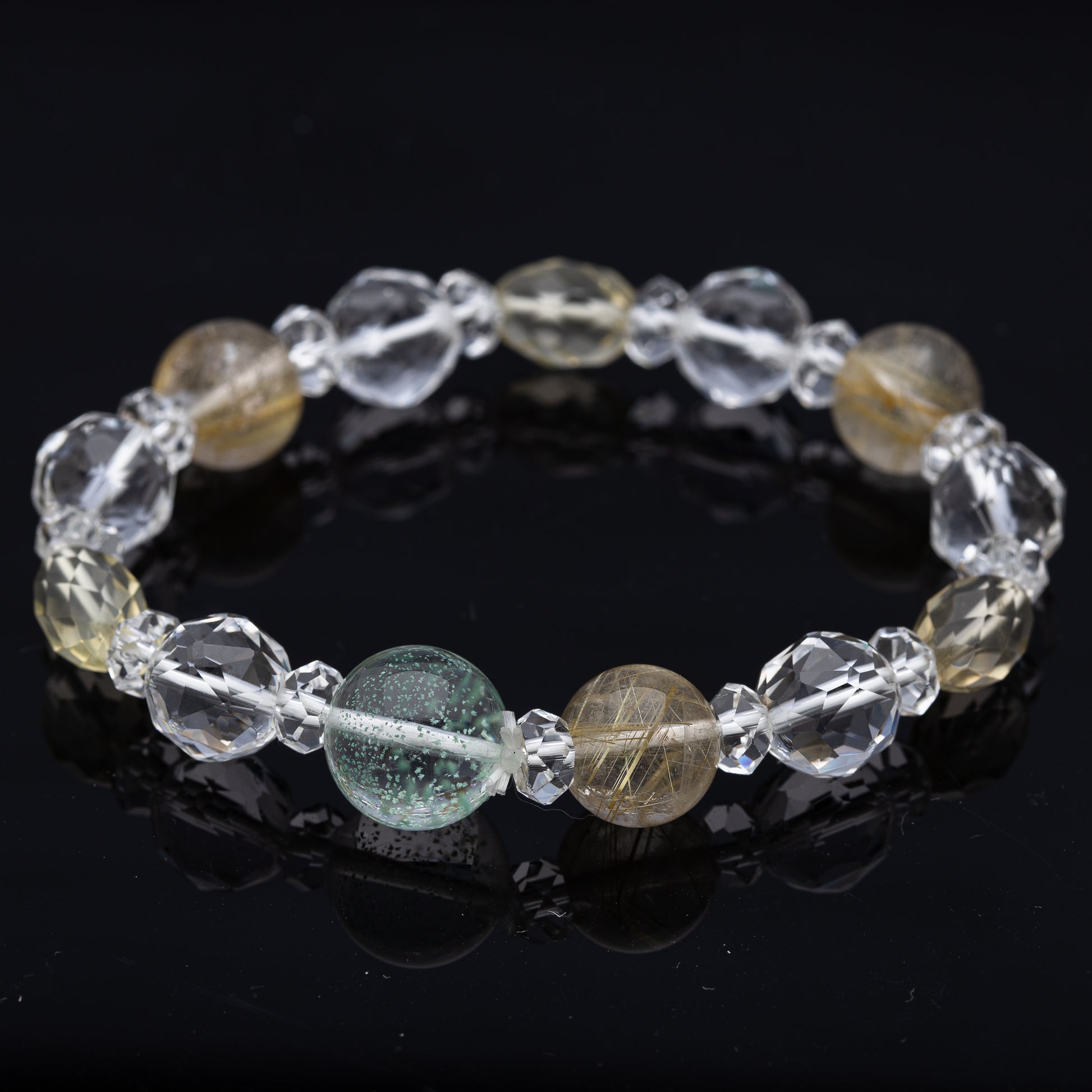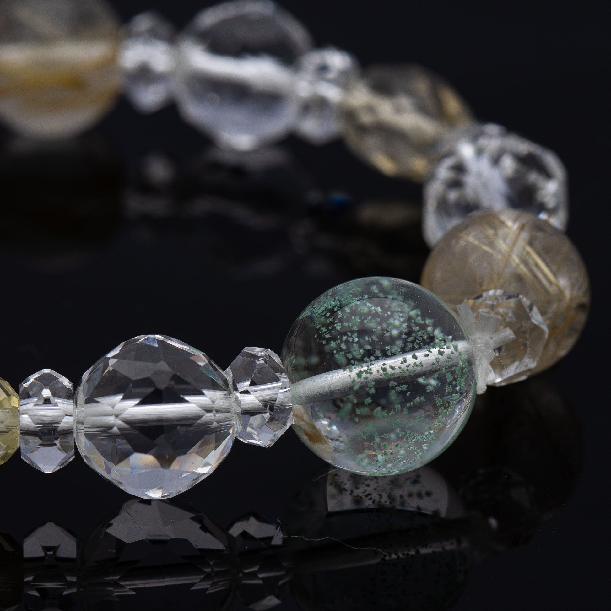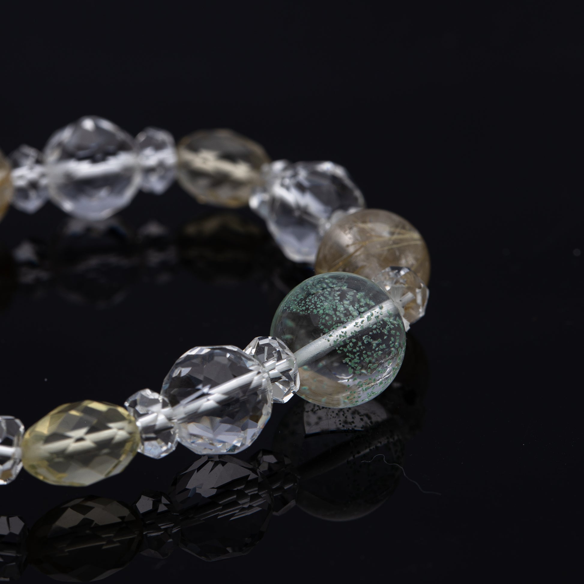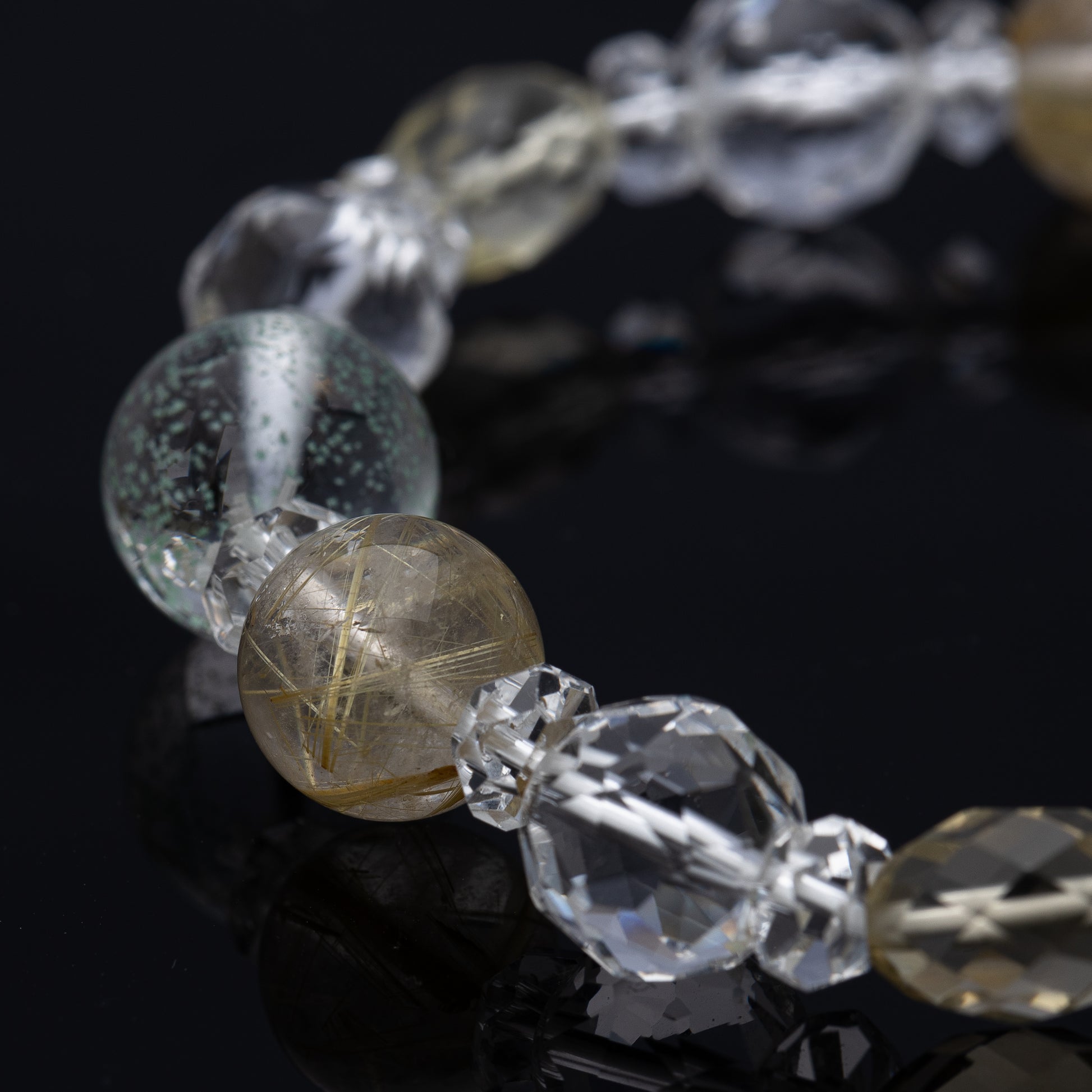 グリーンファントム、ルチルクォーツ、レモンクォーツ、水晶(カット)を組み合わせたブレスレットです。