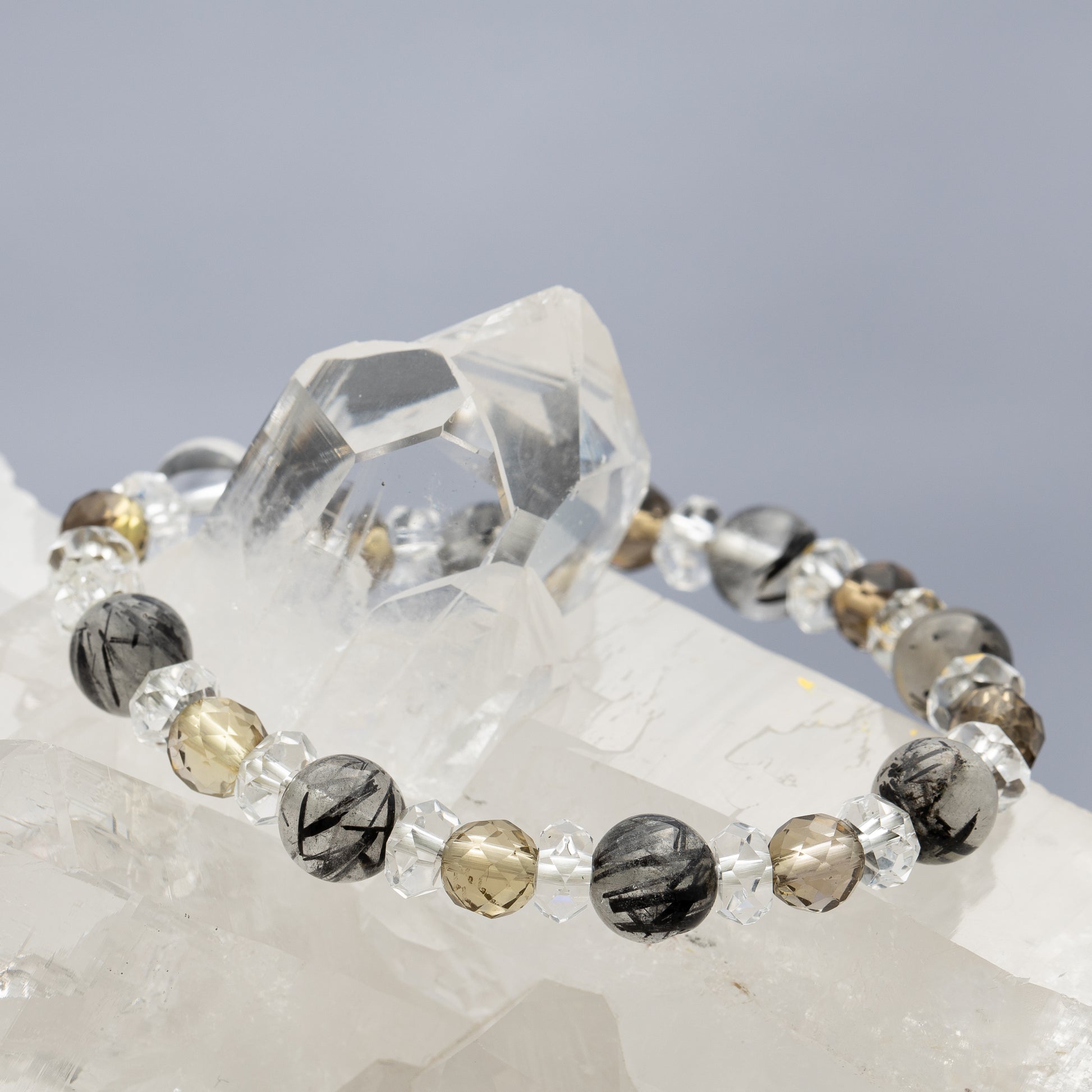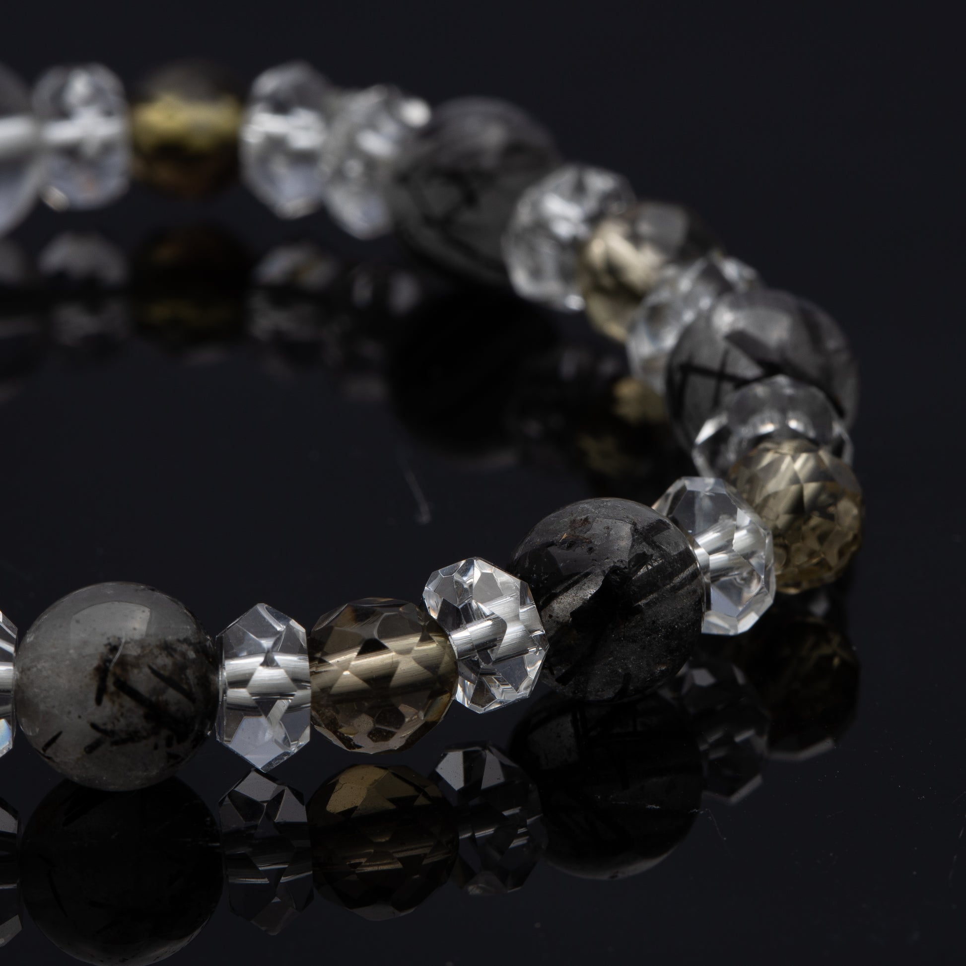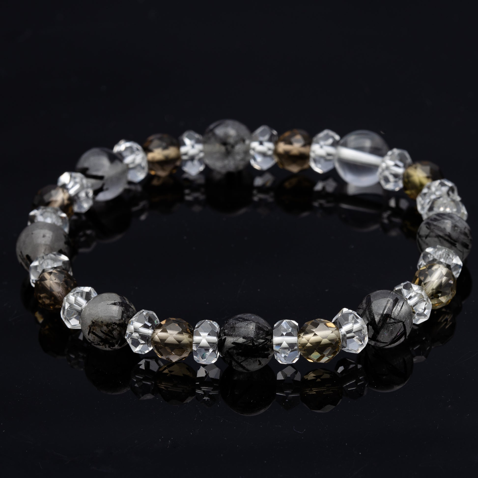ブラックルチルとスモーキークォーツ、水晶を組み合わせたブレスレットです。