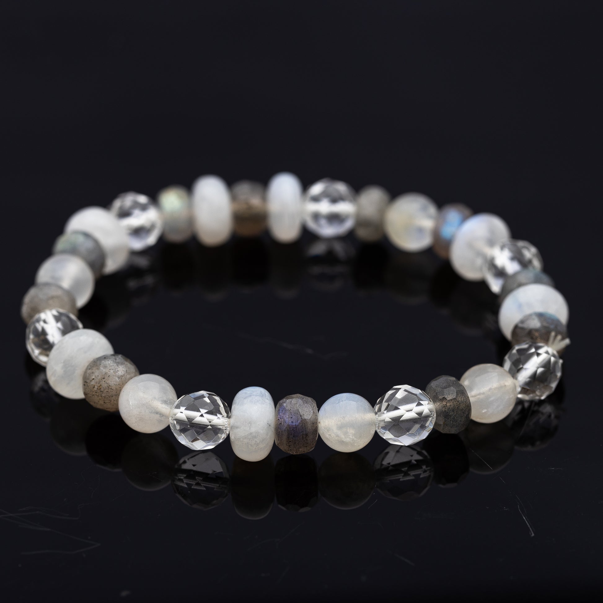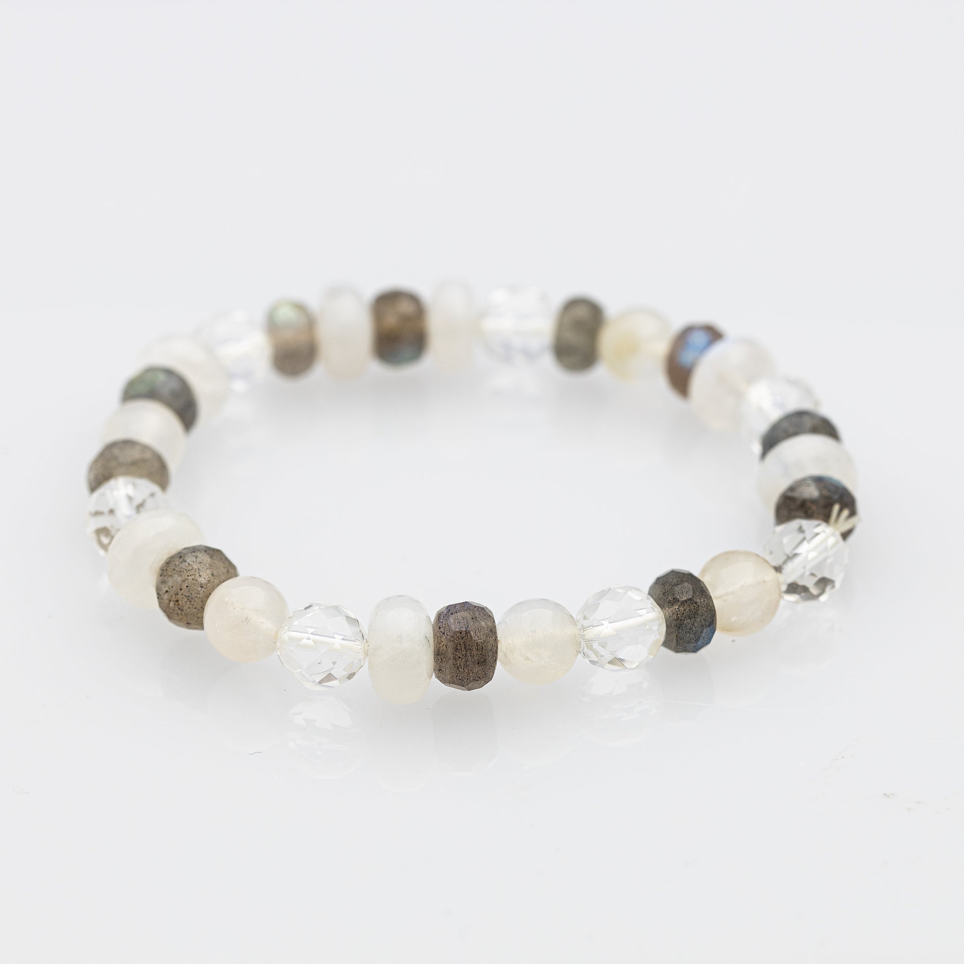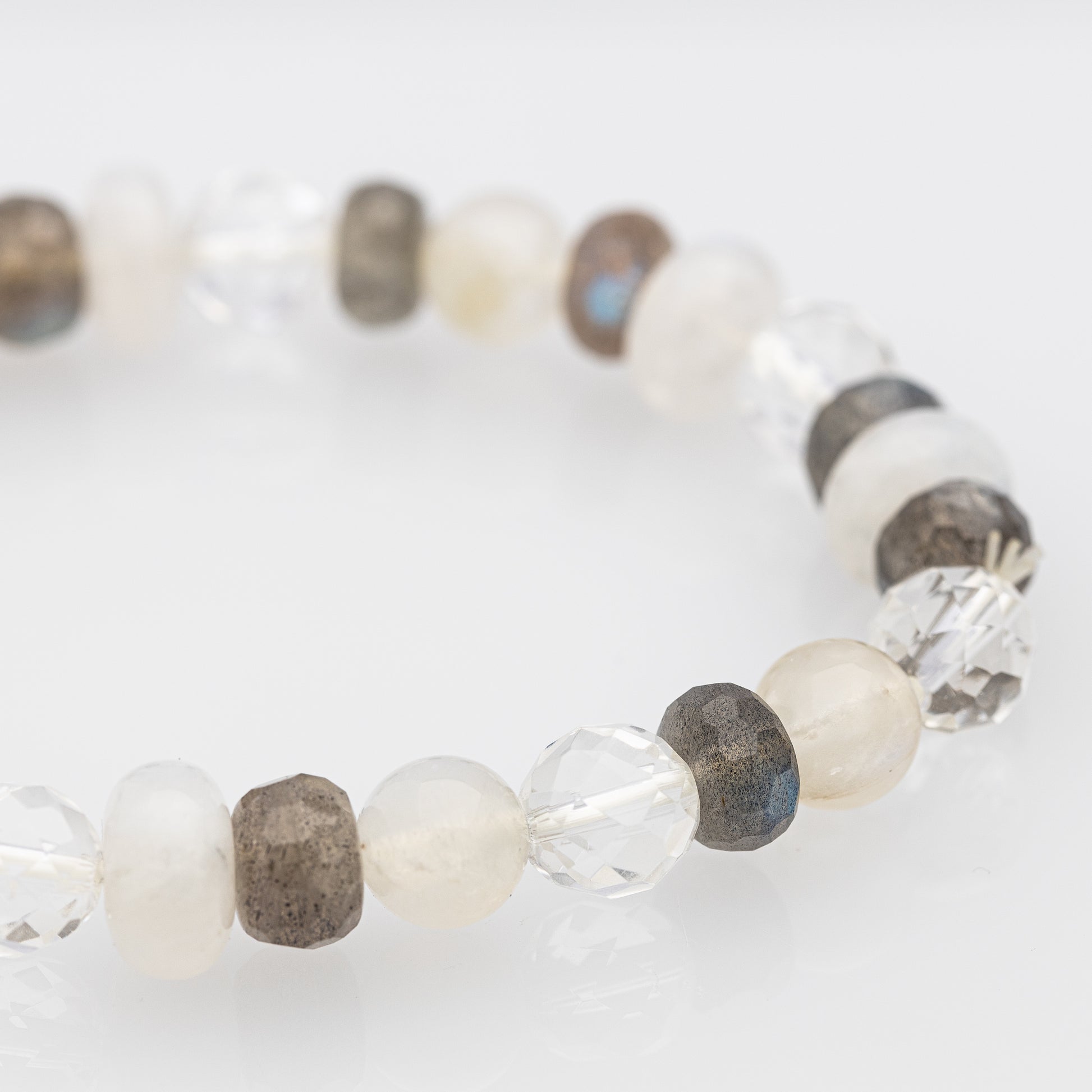 ラブラドライト、ムーンストーン、水晶(カット)を組み合わせたパワーストーンブレスレットです。