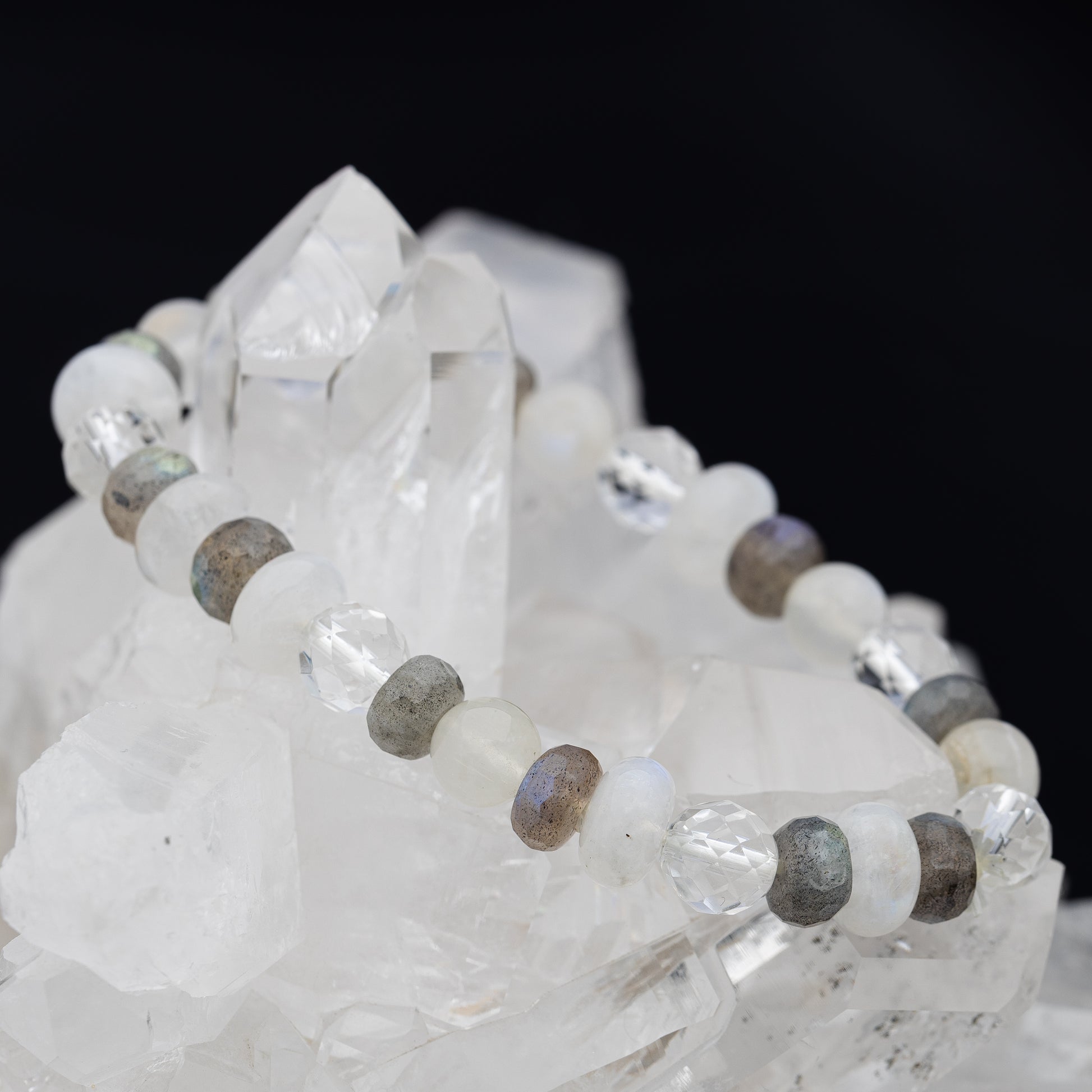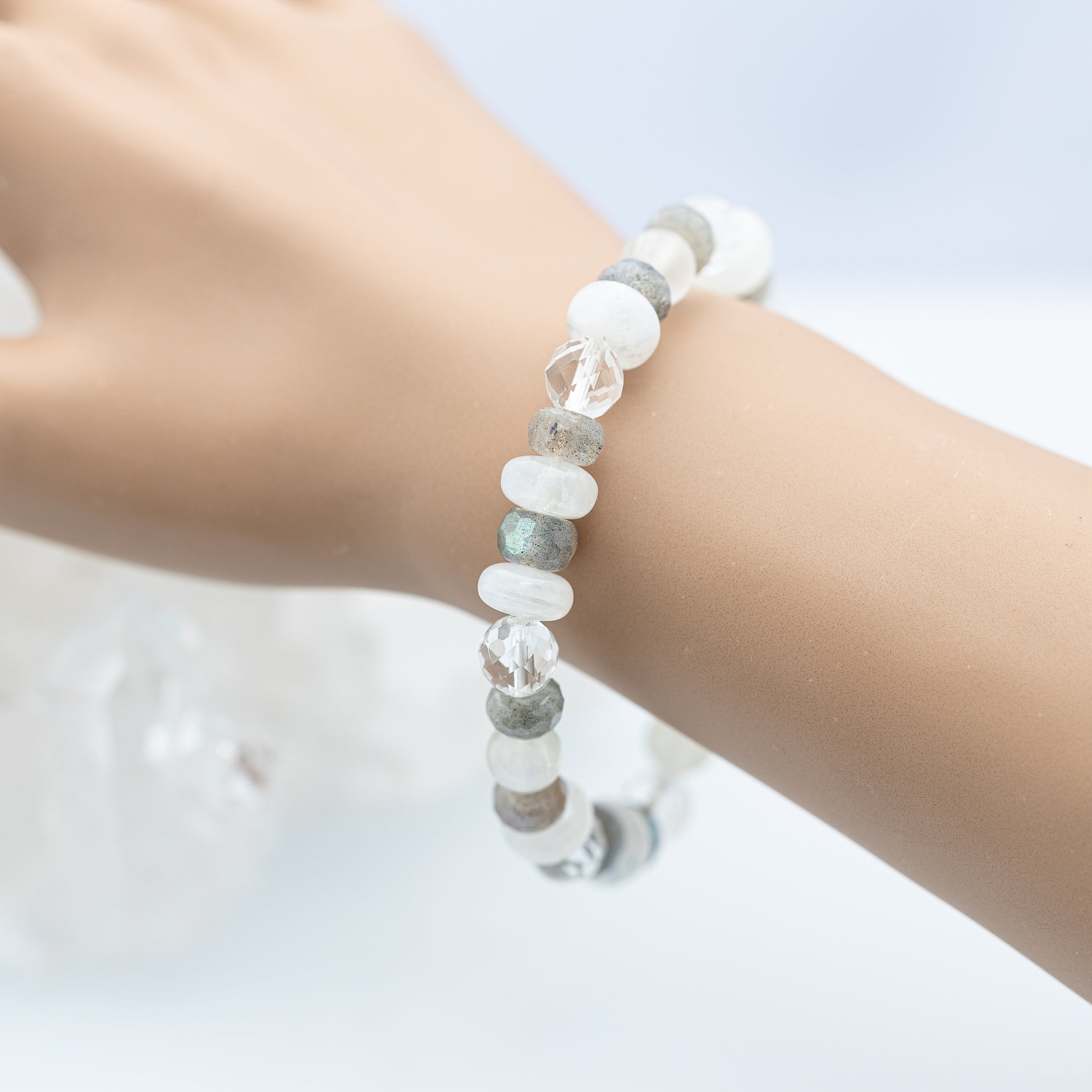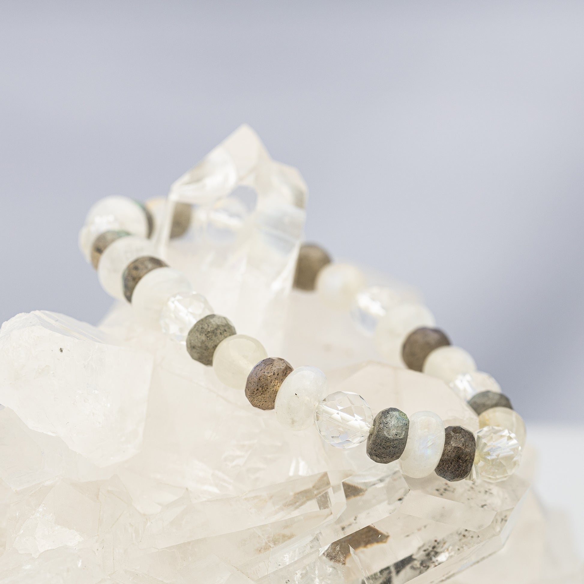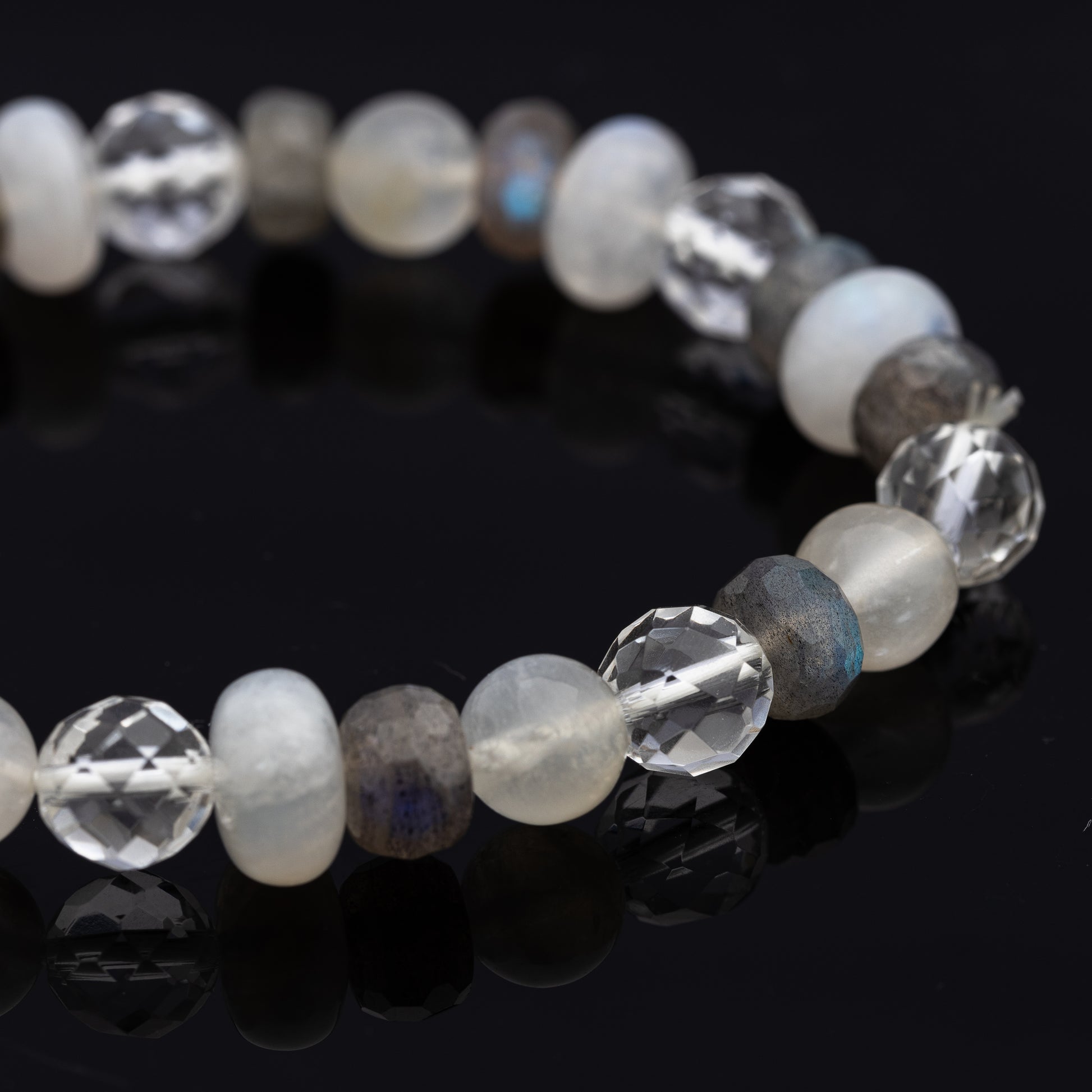 ラブラドライト、ムーンストーン、水晶(カット)を組み合わせたパワーストーンブレスレットです。
